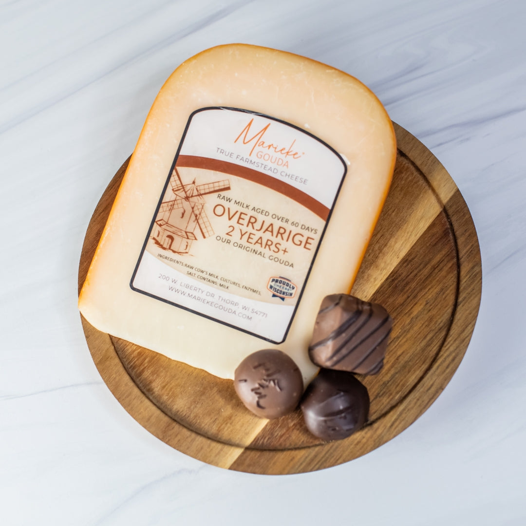 Our utmost aged cheese deserves all of the robust essences that encompass this Gouda. With undertones of spice, coffee, caramel, and roasted nuts this true farmstead Gouda is anything but plain. All Marieke® Gouda is made using fresh raw milk from our family farm. We handcraft each wheel with the finest Old World techniques and age the Gouda to perfection on Dutch Pine Planks.