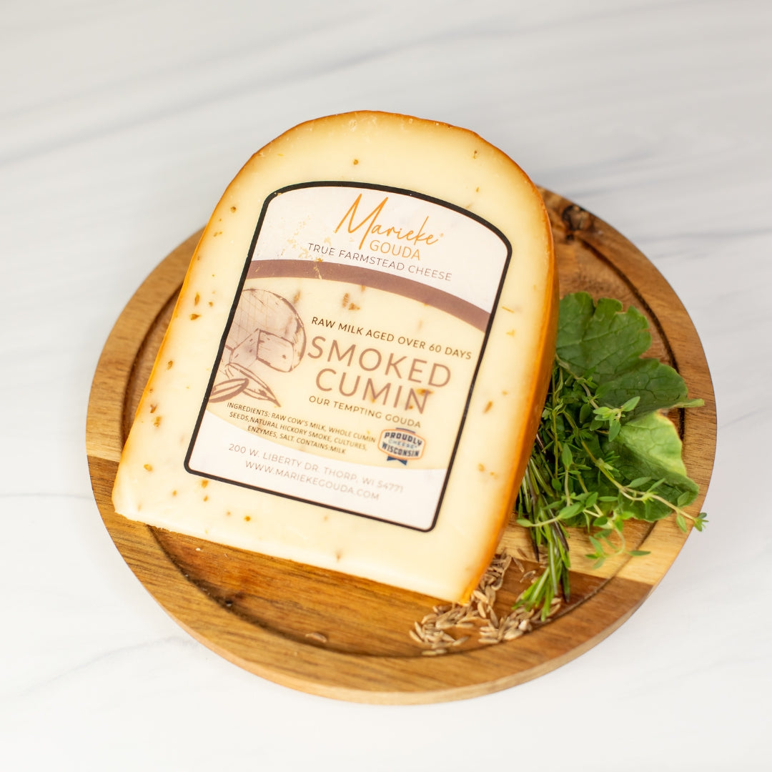 Distinctly sweet scents encompass this Gouda. A subtle spice is enhanced by being smoked over natural hickory wood. All Marieke® Gouda is made using fresh raw milk from our family farm. We handcraft each wheel with the finest Old World techniques and age the Gouda to perfection on Dutch Pine planks for a minimum of 60 days.