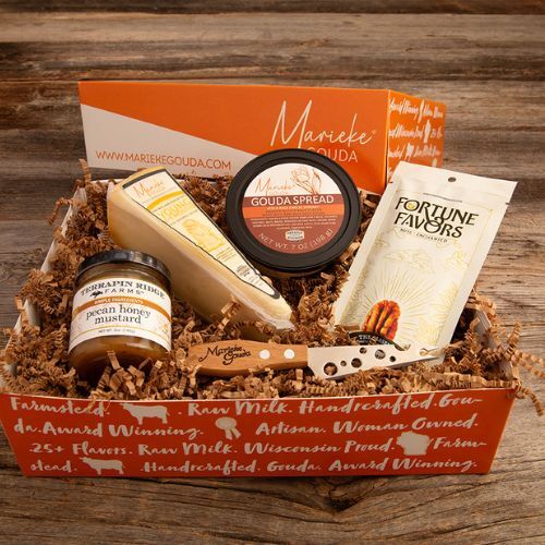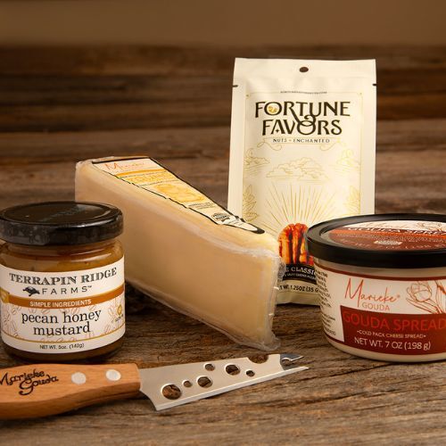 Give the gift of farmstead flavor with this thoughtfully curated starter set. Featuring a hand-crafted wedge of award-winning Marieke Gouda, savory summer sausage, artisan crackers, and our signature honey pecan mustard, this pack brings all the essentials for a memorable snacking experience. Complete with a cheese knife, it’s the ideal introduction to our world of farmstead cheese.