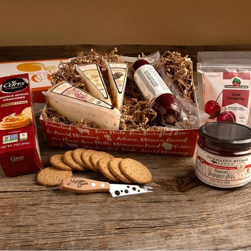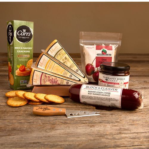 Bring friends and family together with a collection of hand-crafted favorites. With three varieties of Marieke Gouda, summer sausage, artisanal crackers, and a creamy spread or dip, this box is made for sharing. Dried cranberries add a touch of sweetness, while our cheese knife makes serving effortless. A perfect choice for casual entertaining.