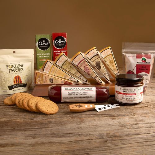 6 pieces of Marieke Gouda, Marieke Summer Sausage, 2 Packs of Crackers, Spread or Dip, Dried Cranberries, Candied Pecans, Cheese Knife