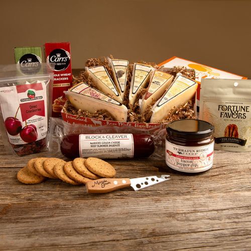 When only the best will do, The Ultimate delivers. Six pieces of Marieke Gouda, two packs of crackers, savory summer sausage, and a decadent spread or dip come together with candied pecans and dried cranberries for the perfect balance of sweet and savory. Complete with a cheese knife, this set is ideal for corporate gifting or impressing a crowd.