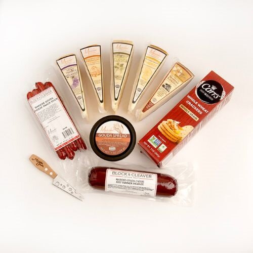 5 pieces of Marieke Gouda, Marieke Gouda Cheese Spread, Marieke Summer Sausage, Marieke Beef Sticks, Crackers, Cheese Knife